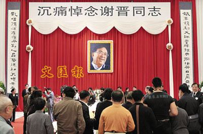謝晉導演的遺體告別會定於今日下午三時舉行,記者下午1時左右抵達上海龍華殯儀館門口時,送別謝晉的人群已在大廳外排成一百多米的長隊等待入場,他們大部分都是謝晉導演的中老年影迷,手持鮮花,神情凝重。隨著告別會時間的臨近,越來越多的群眾前來弔唁,告別大廳外人山人海,場面甚至一度失控,正門亦被迫關閉,之後到來的藝人只得從側門入場。前來弔唁的群眾、藝人亦大多身著素衣,不過謝晉導演的告別儀式卻色彩華麗——紅毯一路從廳前廣場經樓梯鋪到靈柩,大紅的幕布上掛著謝晉彩色的遺像,紅底彩色劇照的簽名板,紅底裝裱的巨幅工作照,恰如一場盛大的電影頒獎禮,亦如謝晉導演生前熱烈、奔放的性格。