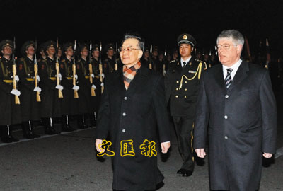 ■溫家寶出席俄副外長博羅達夫金主持的歡迎儀式。 新華社