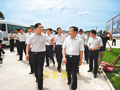 遼寧省長陳政高(前右)在瀋陽市東陵區視察重點項目建設情況。副市級幹部,瀋陽民用航空產業國家高技術產業基地管委會黨工委書記、主任,東陵區區委書記沙波濤(前左)陪同。