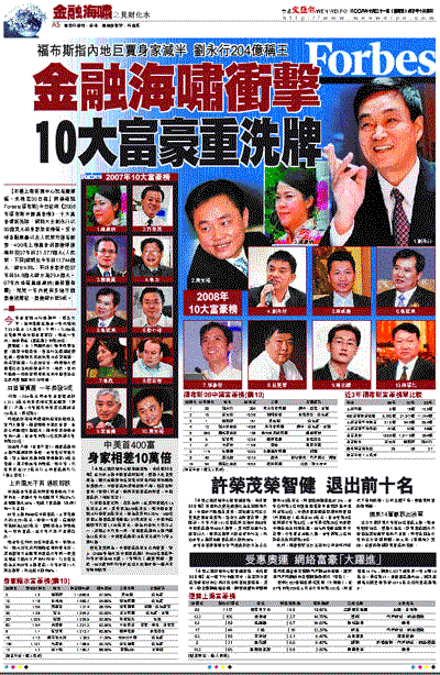 【本報上海新聞中心記者唐湛嫣、朱姝哲30日電】商業雜誌Forbes(福布斯)今日發佈《2008年福布斯中國富豪榜》,十大富豪重新洗牌,飼料大王劉永行以30億美元的身家榮登榜首。受全球金融風暴以及人民幣升值等影響,400名上榜富豪的資產淨值總和從07年的21,577億元(人民幣,下同)縮減至今年的11,744億元,縮水45%;平均身家亦從07年的54.8億元縮水為29.4億元。07年內地首富楊惠妍(碧桂園老闆),短短一年內更有多達千億資產被蒸發,資產縮水近9成。