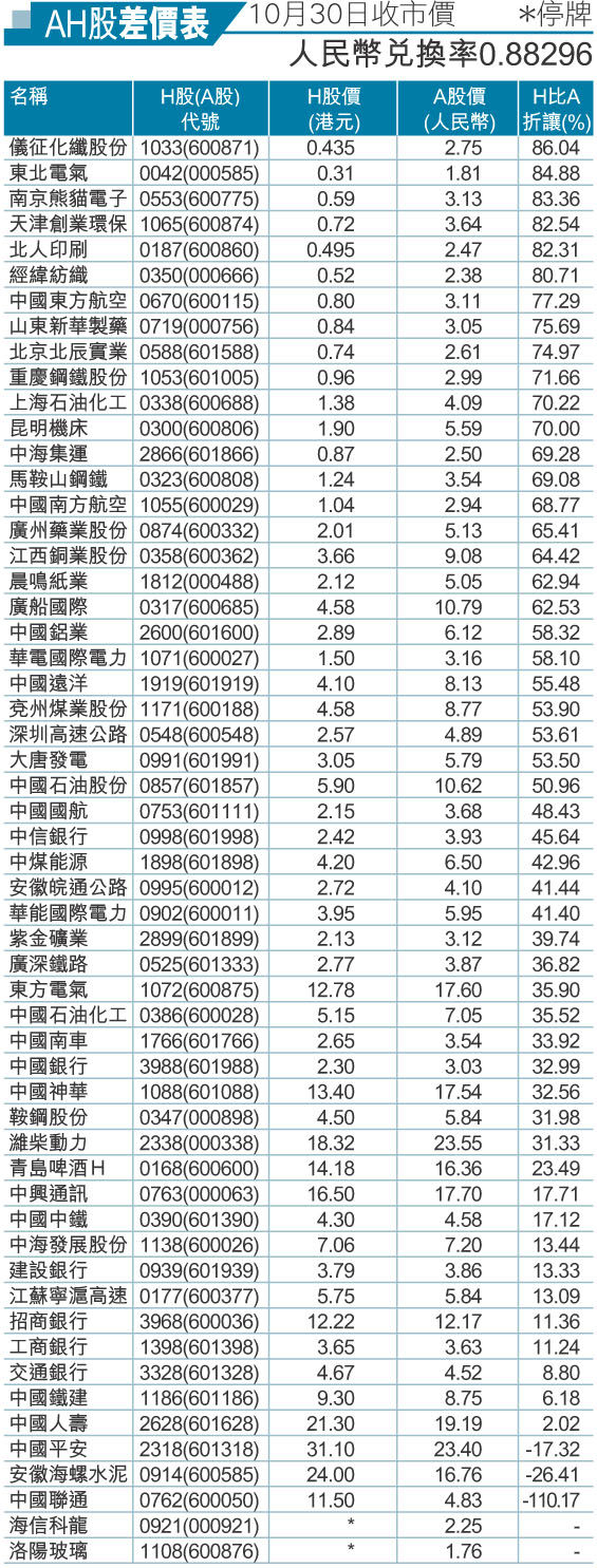 AH股差價表 10月30日收市價 (圖)