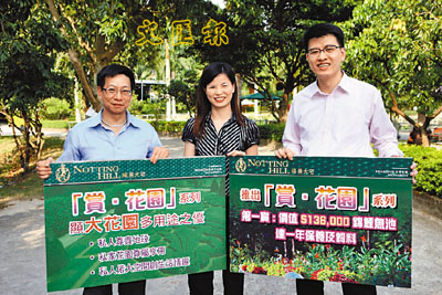 ■長實高級營業經理袁添鴻(左)、營業經理曹皎明(中)及楊聰永,推介四季名園峰景大宅特大花園多用途的優點。