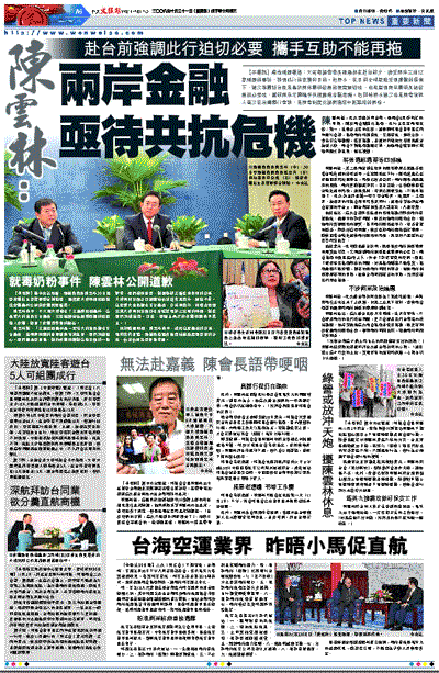 陳雲林說,其二是考慮到全世界的經濟發展正面臨著國際金融危機的嚴峻威脅,全球經濟在下行,經濟衰退已在多個國家和地區發生,衝擊已波及亞洲,兩岸經濟都面臨新的困難。兩岸更應攜起手來,互幫互助,合作應對國際金融危機的衝擊,渡過難關。時間已經很緊迫,不能再拖延了。此次訪台將邀請一些大陸金融界、航運界、工商界、旅遊界的海協會理事和專家同行,就是希望他們在兩會搭建的平台上,與台灣有關專家共謀良策,共渡時艱。