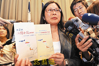 ■陸委會主委賴幸媛30日在行政院院會後記者會上拿著剛出爐的傳單,說明江陳會的重要性。 中央社