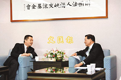 ■台灣海基會董事長江丙坤(右)在台北會見赴台的大陸深航公司常務副總裁劉劍平。