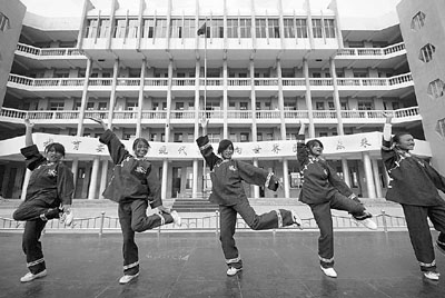 ■圖為中學生跳起「錦雞舞」課間操。新華社