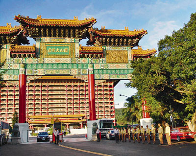 ■圓山飯店牌樓底下,眾多警察監控來往車輛、行人來往。本報台北傳真
