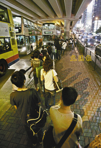 國際七人欖球賽盛事,昨午香港大球場上演新西蘭隊對澳洲隊,吸引大批球迷捧場。灣仔、銅鑼灣一帶因受影響致車多人多,交通擠塞。灣仔鵝頸橋底的巴士站,出現多條等候巴士的人龍。 本報記者劉國權 攝
