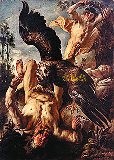 在神話中,普羅米修斯是古老泰坦神族後裔,是地母蓋亞與天父烏拉諾斯伊阿佩托斯的兒子。普羅米修斯與女神雅典娜共同創造了人類,又教會了人類很多知識。當時宙斯禁止人類用火,他看到人類生活的困苦,幫人類從奧林匹斯偷取火種,故觸怒了宙斯。宙斯將他鎖在高加索山懸崖,每天派一隻鷹去啄吃他的肝,又讓他的肝每天重新長上,使他日日承受被鷹啄食肝臟的痛苦。但普羅米修斯始終堅毅不屈。幾千年後,赫剌克勒斯為尋找金蘋果來到懸崖邊,把鷹射死,並讓半人半馬的肯陶洛斯族的喀戎來代替,解救了普羅米修斯。