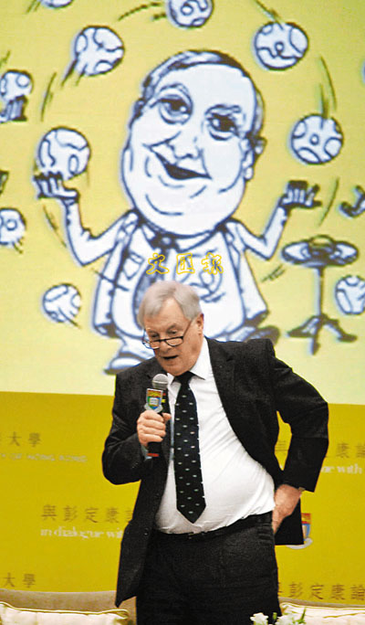 ■彭定康出席港大論壇時露出肥肚腩。本報記者曾慶威 攝