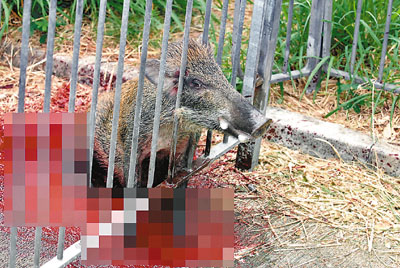 【本報訊】野豬衝欄被夾死事件又再發生。一頭剛成年的野豬,昨晨8時許,在上水大頭嶺村疑外出覓食時離群,誤撞向引水道一道鐵欄時,遭兩條鐵枝夾住頭部,幾經掙扎仍未能脫困,導致頸部遭鐵枝割至重傷,血流滿地;消防員趕至以帆布蓋著牠的眼部其穩定情緒後,再由漁護署女獸醫打麻醉針將其救出,事件擾攘約2小時,惟經檢查證實野豬傷勢太重,需人道毀滅。