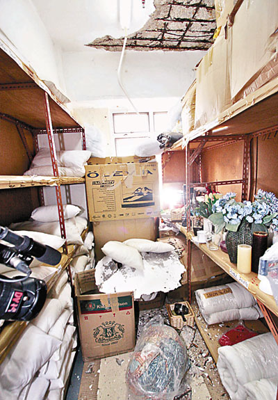 黃竹坑道34號5樓一間家居設計公司貨倉,昨午1時50分,當一名38歲外籍女設計師ANIERE與多名同事入內挑選傢具時,天花一幅4乘4呎石屎突然剝落掉下,ANIERE不及提防,近右邊後腦位置當場被石屎擊中受傷流血,她痛至大叫,驚動在場同事報警,將她送院。本報記者溫瑞麟 攝