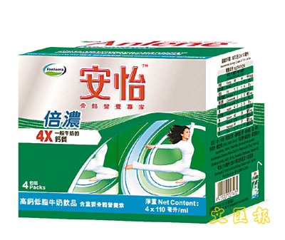 研究指出普遍亞洲女性每天從飲食中攝取的鈣質為350至470毫克,遠低於所建議的每天1,000至1,200毫克的攝取量,因此不少女性都有骨質疏鬆問題。細小的安怡倍濃每包只有110毫升,但卻可以提供570毫克鈣質,即相等於一般牛奶的4倍,是補充鈣質的最佳選擇。