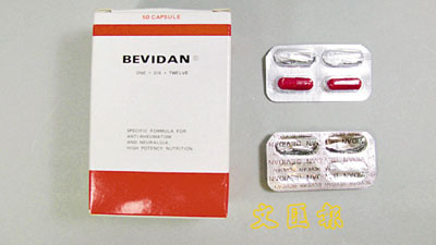 【本報訊】一名59歲男子為減輕肌肉痛楚,服用一款名為「Bevidan」(見圖)的產品。用後,出現高血壓、高血糖、圓臉及肌肉乏力等症狀,現時情況穩定,毋須入院。衛生署表示,該產品被發現含有潑尼松龍及甲芬那酸,長期服用潑尼松龍可引致圓臉,高血壓、高血糖及胃潰瘍,而長期服用甲芬那酸則會引致腸胃不適、惡心、胃痛及出血。衛生署呼籲,市民不要購買及服食「Bevidan」。