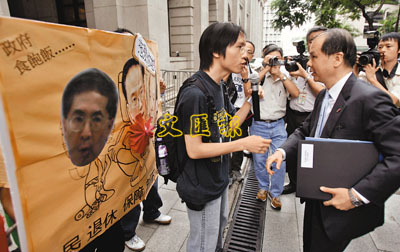 ■多個團體昨在立法會門外請願,要求當局制訂全民退休保障計劃。圖為張建宗接受請願者的信件。本報記者梁祖彝 攝