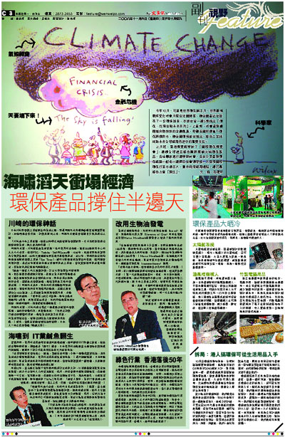 上月底,香港博覽館舉辦了「國際環保博覽會」,邀請全球過百綠色廠商展銷尖端環保產品,各地專家進行連串研討會,各自分享最新環保經驗。記者一連兩日在會場穿梭,方發現國際環保行業市場巨大,看來縱使經濟塌陷,還可靠綠色力量「頂住」。