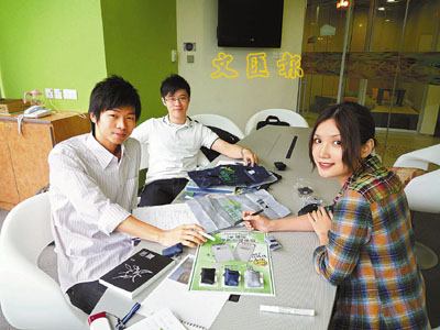 ■施躍翔(左起)、鄭華榮、蘇雪芬等每到周末都會借用政府免費提供給青年人創業的工作間,研究環保產品的市場推廣。 本報記者覃卓嘉 攝