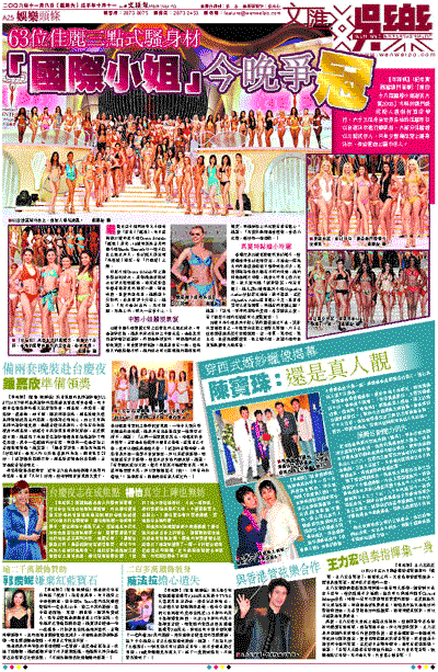【本報訊】(記者黃佩麗澳門直擊)「第四十八屆國際小姐選美大賽2008」今晚於澳門威尼斯人渡假村酒店舉行,六十三位來自世界各地的佳麗昨日以自選泳衣進行總綵排,大部分佳麗都以三點式示人,只有少數幾位穿上連身泳衣,有些更披上圍巾示人。
