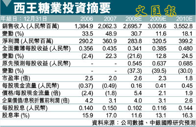 考慮到三聚氰胺事件、海外市場銷售放緩以及副產品價格回落等不利影響,我們將西王糖業(2088)08、09和10年盈利預測分別下調37.3%、39.5%和30%。由於副產品價格出現回落,但使用豐收前採購的玉米造成生產成本依然較高,因此下半年公司的毛利率面臨很大的壓力。我們認為這種情況會在本月隨著低玉米成本的產品上市而有所緩解。預計下半年盈利將由上半年的2.19億元人民幣下滑至6,500萬元。與此同時,我們認為玉米油資產的注入將受股市低迷以及商品價格大幅下降影響而被推遲。