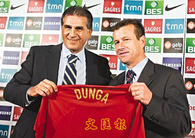 ■鄧加(右)日前到訪葡萄牙國足總部會晤教練奎羅斯。 法新社