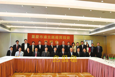 ■重慶市渝北區區委書記周旬(前排中)在港會晤港商並合影留念。 本報記者張蕊 攝