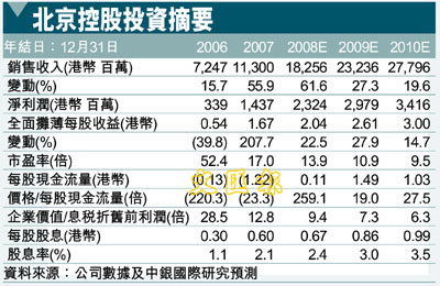 到2013年,北京控股持股74.8%的北控水務集團(0371.HK/港幣0.80,未有評級)日處理能力將從08年6月的150萬噸提高至500萬噸。水源十廠的一二期工程和濰坊水廠的一期工程已經投產,日均100萬噸的水供應業務利潤率超過了30%。我們認為08-10年,燕京啤酒(000729.SZ/人民幣10.43,同步大市)的收入將增長8-14%,利潤增長將達到16-28%。北京控股在燕京啤酒擴張計劃中通過增發投資9億人民幣,將帶來8%以上的現金收益,09年以後每股收益將增厚。我們認為在2010年以後,北京機場高速和深圳石觀高速不會出現增長。