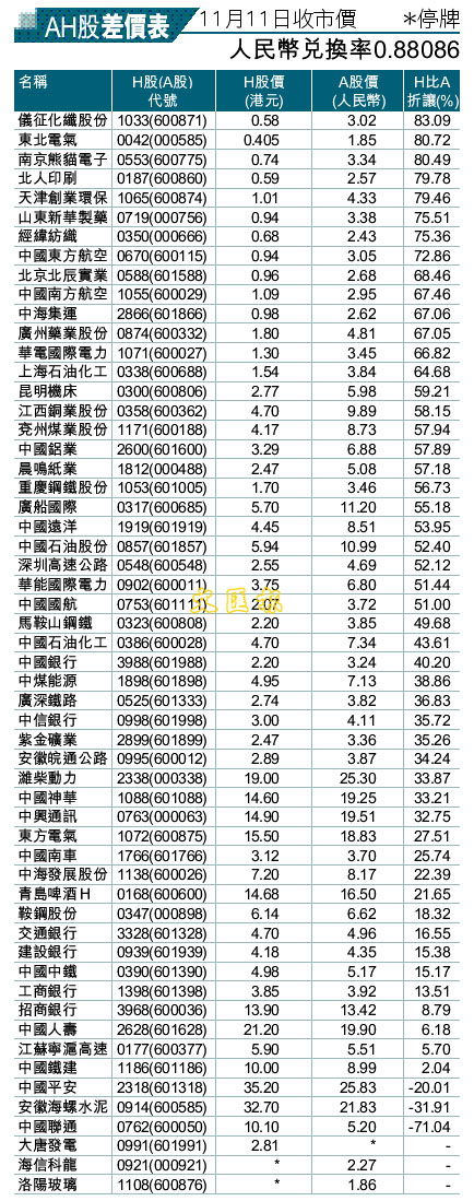 AH股差價表(11月11日收市價 *停牌 人民幣兌換率0.88086)
