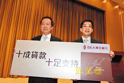 ■新鴻基地產代理執行董事雷霆(左)及東亞銀行總經理兼個人銀行主管唐漢城,介紹壹號雲頂「十成貸款」優惠。本報記者張偉民 攝