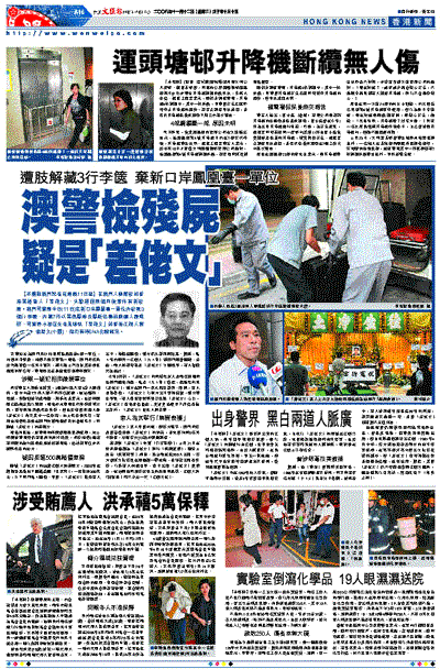 【本報駐澳門記者陸展鵬11日電】在澳門人間蒸發的香港黑道猛人「差佬文」,失蹤超過兩個月後案件有新發展。澳門司警局今日(11日)在新口岸鳳凰臺一單位內發現3個行李篋,內藏7件以黑色膠袋及膠紙包裹的腐爛人體殘肢,司警表示相信死者是綽號「差佬文」的香港江湖人物黎經文(小圖),但仍有待DNA化驗確定。