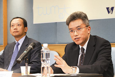 蘇渭樑(右)表示,澳洲已立法推行用水效益標籤計劃,並指市場上已有節水花灑供市民選購。 本報記者潘達文 攝