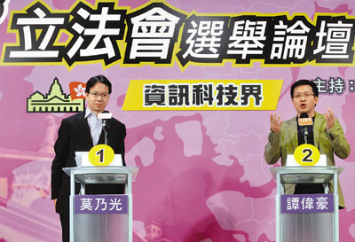 ■莫乃光指譚偉豪違規利用電視廣告宣傳,及選舉經費超出上限逾百萬,入稟高院尋求司法覆核。圖為2人在9月的選舉論壇上。 資料圖片