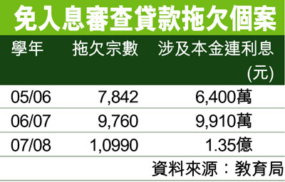 教育局局長孫明揚以書面回覆立法會議員質詢時指,07/08學年供學生申請的3項「免入息審查貸款計劃」,累積拖欠2季以上的總金額達1.35億元,涉及10,990宗個案,而有關個案帳戶尚有3.93億元未到期本金,若有關人等不依時還款,總拖欠金額隨時逾5億元。按學資處數字,前兩學年有關計劃的欠款數字只為約6,400萬元及9,910萬元,可見07/08年拖欠還款情況急增。