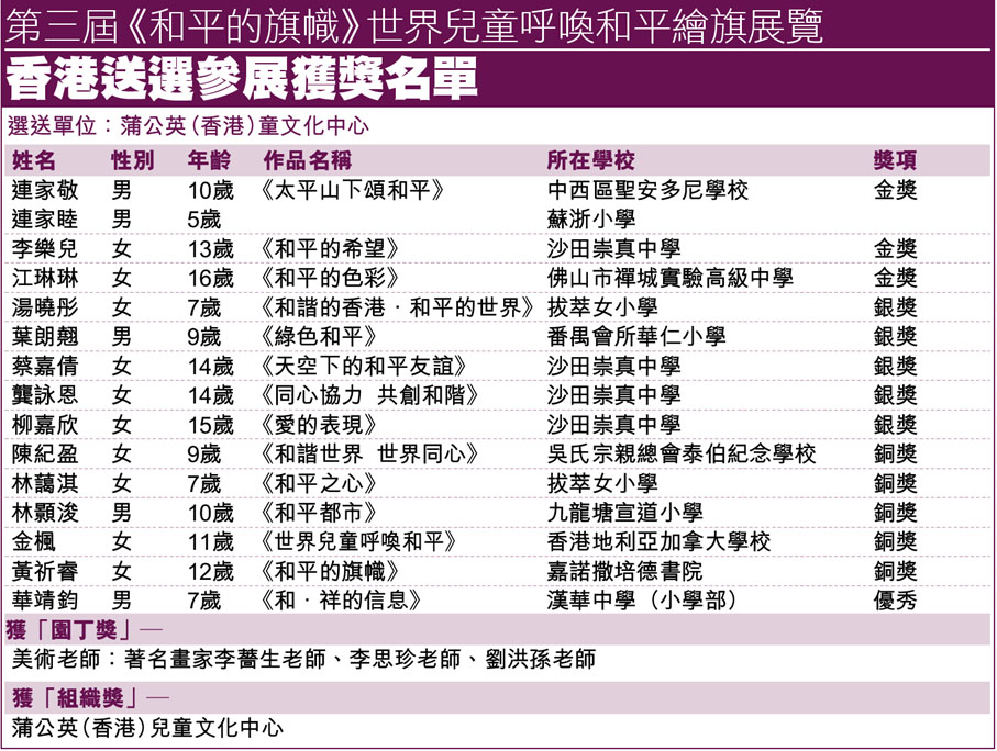 第三屆《和平的旗幟》世界兒童呼喚和平繪旗展覽香港送選參展獲獎名單 (圖)