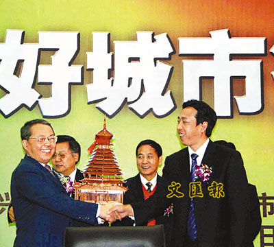 ■嘉興市政協副主席翁可雄(左)與懷化副市長王志群,在締結儀式上互贈禮物。
