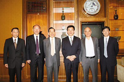 ■新世界集團主席鄭裕彤、新世界中國地產主席鄭家純、副主席杜惠愷與重慶市政府市長王鴻舉、常務副市長黃奇帆、財政局局長劉偉合影。本報記者張萍 攝