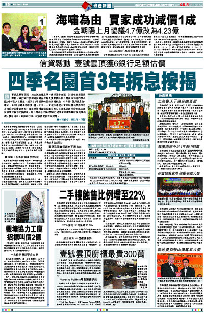 他續稱,匯豐銀行上周帶頭減息四分之一厘,相信還有減息空間,對供樓人士始終可以鬆動一點,令他們增加消費,刺激經濟。他認為,只要價格公道,銀行不會估價不足,他相信,真正買樓人士手頭上已有一定資金,最重要是買家所選購的樓盤是否適合自己需要,不會因為銀行估價不足便不置業,以四季名園已售出約180間屋為例,並無買家遇到銀行估價不足問題。