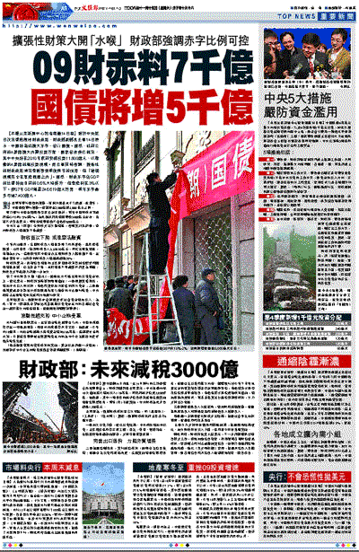 【本報北京新聞中心記者海巖14日電】對於中央近日決定重啟積極財政政策,財政部副部長王軍14日表示,中國將為此擴大赤字、發行國債。據悉,此前公佈的4萬億擴大內需投資方案,國家發改委已確定,其中中央將在2010年底前安排投資11,800億元,以帶動約4萬億的總投資規模。而王軍同時強調,擴張性的財政政策肯定會影響到明後兩年的預算,但「這個規模完全在掌控範圍之內」。據悉,財政赤字佔GDP的比重將由目前的0.6%大幅提升,但會控制在3%以下。按07年GDP總量246,619億元計算,明年赤字最多可達7,400億元。對於明年發行國債的規模,有關方面並未予以透露。近幾年,中國國債發行規模一直維持在2,000億到3,000 億元之間。