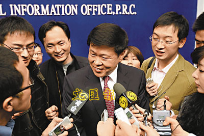 ■財政部副部長王軍(中)表示,積極財政政策實際等於擴張性政策,中國將擴大赤字,發行國債。 中新社