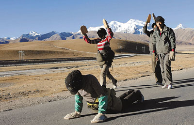 入冬以來,佛教信徒開始進入朝佛高峰。圖為幾名朝佛者一步一磕,向拉薩大昭寺進發。 新華社