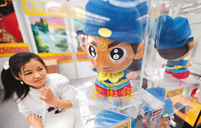 11月14日,為期3天的第二屆全國文化紀念品博覽會在安徽合肥開幕,近200家知名文化企業參會。圖為一位女孩在觀看一款合肥歷史名人包拯形象的紀念品。 新華社