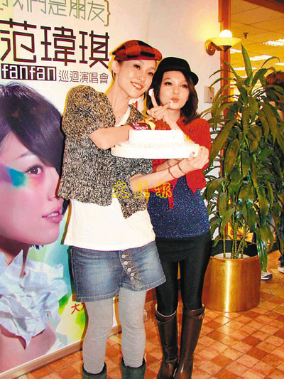 范瑋琪2008巡迴演唱會《我們是朋友》將於11月22日在台中舉行,昨日好友張韶涵就帶來「蕾絲邊甜心造型草莓蛋糕」送給范范,預祝她台中演唱會成功。雖然范范在台北的首場演唱會,張韶涵因有工作而無法擔任嘉賓,讓外界一度傳出二人不和消息。不過現場看來兩人非常有默契,均戴帽子、穿長靴,更經常密密斟,范范又拿出唇糕幫張韶涵補妝,而張韶涵則作勢向范范砸蛋糕,相當搞笑。兩人異口同聲地強調:「別再說我們不合了!我們好的很!」之後又分享彼此開演唱會「吊鋼絲」心得。為了表明自己力挺范范到底,張韶涵決定捨棄約港元47萬的西安演出,為范范個唱擔任嘉賓,這個好姊妹真唔話得! ■文︰若谷