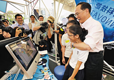 曾蔭權昨出席在維園舉行的「科學為民」嘉年華會開幕儀式,並到創新科技署的攤位,肉緊地攬著參加創意科藝工程計劃的小孩。本報記者李志樑 攝