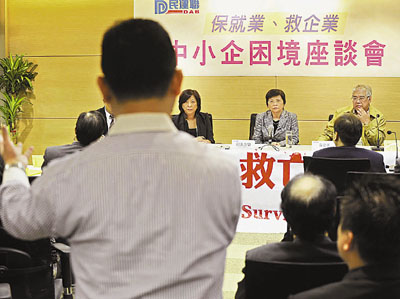 民建聯副主席蔣麗芸、立法會議員黃定光等昨日邀請劉吳惠蘭與50名中小企代表進行座談會,聽取他們對特區政府支援中小企措施的意見。多名出席的中小企代表都批評,銀行與中小企存在對立的關係,不斷對中小企「窮追狂打」,並反問是否「要中小企無晒先安心」。中小企業國際化創會主席朱革寧更直言﹕「全世界政府只有香港剩係依靠地產與金融。」又指內地港資企業不時「被人瓊打,而且被人砌」,批評特區政府只懂思考「古靈精怪」的事。