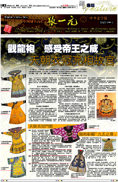 在中國古代,衣冠是劃分等級及辨別尊卑的標誌,也是歷代帝王熱衷改革的產物。衣冠到清代已經演繹得完美絕倫,無可挑剔。北京奧運期間,故宮破例從萬餘件珍貴服飾中,挑選105件清代帝王禮服、吉服、行服、便服,題為「天朝衣冠」,在午門展廳展出百日。