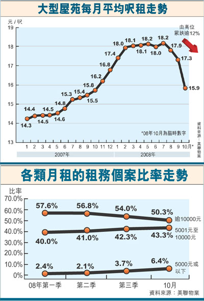 受金融海嘯影響,本港物業樓價下挫,而租金亦跟隨下調,惟跌幅較樓價為少。據美聯集團促成的租務個案計算,10月份本港大型屋苑的平均呎租約15.9元,較9月份下跌約8%,連跌3個月,累積跌幅逾12%,數字重返至1年前的水平。