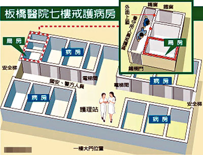 【本報訊】據《聯合晚報》17日報道:陳水扁今日上午在層層警力戒護下轉到台北縣立醫院板橋院區7樓戒護病房住院觀察,但由於該院的戒護病房屬於台北看守所專有,即使無受刑人或在押被告就醫,仍由看守所管理,院方平時並不負責管理,因此有縣立醫院醫護人員私下戲稱7樓戒護病房是「獄監醫院」、「阿扁等於送進監獄醫院」。