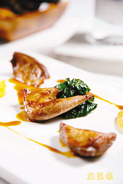 用上味道較濃的法國鵪鶉,以低溫的華氏62度烤煮25分鐘,外表香脆,肉質半熟而嫩滑,配上酸甜的紅洋蔥果醬同吃,實在滋味。Roasted Pigeon, Apple and Spinach, Red Onion Jam, Pigeon Jus($330)(a)