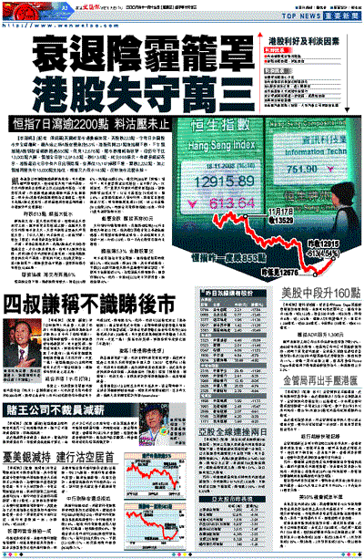 凱基證券亞洲區營運總裁鄺民彬指,昨日港股雖然跌幅較大,但相信並非新一輪的尋底,今次的跌浪未必會跌至上次10,600點的低位。以現市況來看,外圍經濟衰退是港股的最大負面因素,而中央4萬億元刺激經濟則為正面因素,但昨日內地A股已見回吐,反映這個利好因素漸消退,令港股突然出現崩盤。