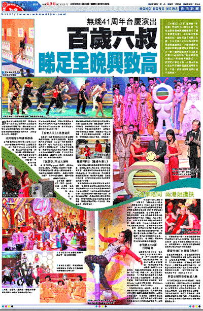 【本報訊】(記者 黃佩麗、李思穎)無線昨日41周年台慶,特地在將軍澳電視廣播城舉行「萬千星輝賀台慶」,該台逾百藝員傾巢而出,當晚可謂「舞動」台慶,全台花旦小生以中西合璧豪華歌舞揭開序幕。大會安排兩位司儀汪明荃和鄭裕玲夾定著紅色衫,實行像兩封紅利是左右伴著年屆101歲的TVB行政主席邵逸夫爵士(六叔)主持亮燈儀式,志偉也花盡心思在門牙鑲閃石營造出哨牙效果,不過,搞到說話時出現口齒不清現象。