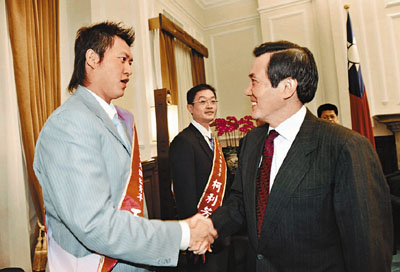 馬英九(右)19日會見台棒球名將王建民等第46屆十大傑出青年當選人。 中央社